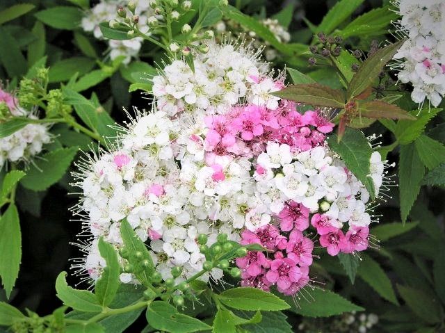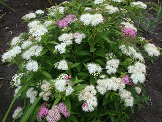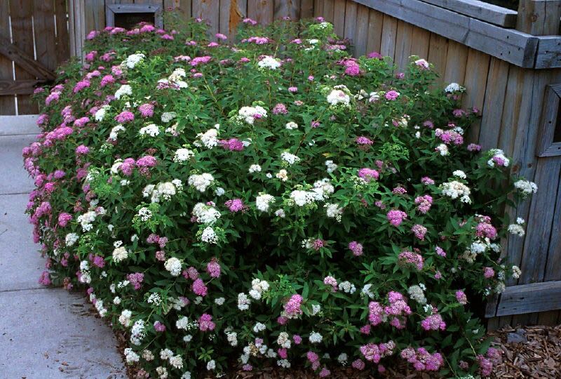 Цветет на побегах текущего года с июля по август-сентябрь, цветки собраны в плоские щитковидные соцветия. Цветки белого, розового и красного цвета одновременно присутствуют в каждом соцветии-щитке.