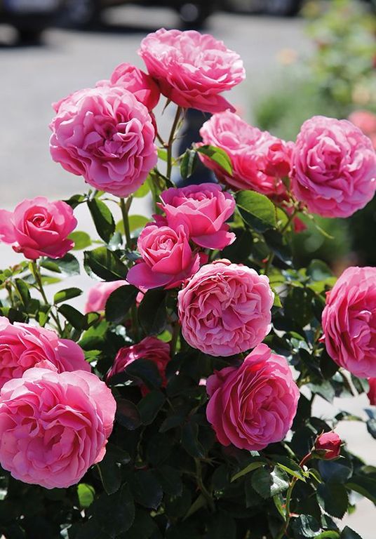 Размер взрослого растения: куст вырастает до 60-150 см. Если произрастает в теплом регионе, то может достигать 2 м в высоту. Ширина кустарника 60-110 см. Растет быстро. Цветение: бутоны цветов крупные, густомахровые, квартированные по центру, равномерно распределены, имеют легкий аромат. Диаметр бутона 7-10 см, насчитывается около 80 лепестков, которые плотно прижаты друг к другу. По мере цветения цветок розы меняет форму. Из округло-заостренного бутона становится бокаловидной. Цвет нераскрывшегося бутона ярко-малиновый. Одна кисть имеет 3-5 бутонов. Период цветения начинается в июне, длится до окончания летнего периода, в теплых климатических условиях может цвести до октября.
