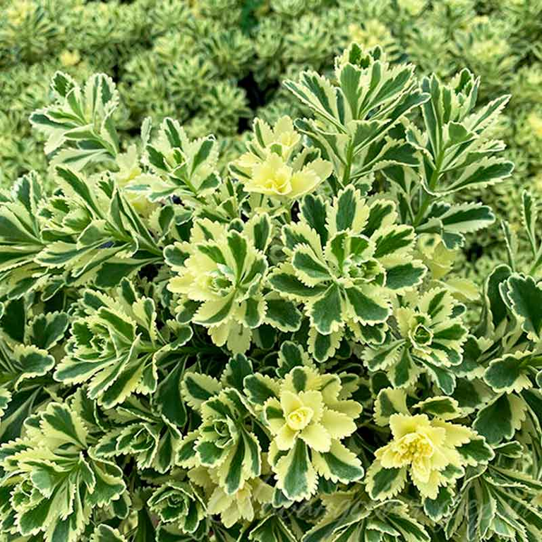 Очиток (седум) Атлантис - Розетки маленьких темно-зеленых листьев с широкими кремово-желтыми краями приобретают розовые тона осенью. Идеально подходит для сухих участков и в качестве почвопокровного растения в каменистых садах или вдоль склонов холмов.