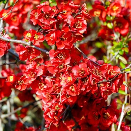 Айва великолепная Фаер Данс-яркие темно-красные роскошные цветы с золотистыми тычинками среди густой темно-зеленой листвы кустарника оживляют любой сад.
