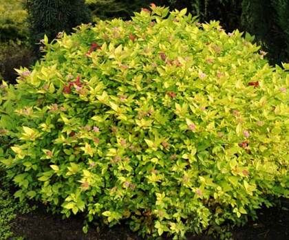 Высотой до 0,6 м, шириной до 0,8 м. По форме напоминает приплюснутый шар. Крона плотная, густооблиственная. Молодые листочки имеют легкий красноватый оттенок, после становятся золотистого цвета и сохраняют этот цвет весь сезон. Листья простые, очередные, среднего размера, продолговатые, зубчатые по краю, расположены часто на побегах. Цветёт светло- розовыми цветками, собранными в щитковые соцветия на верхушках текущих побегов с июня по август. Растет быстро.