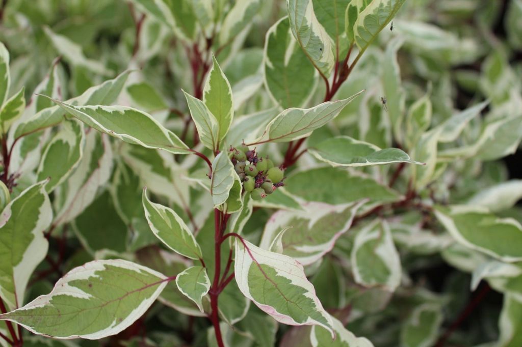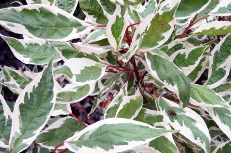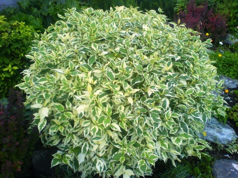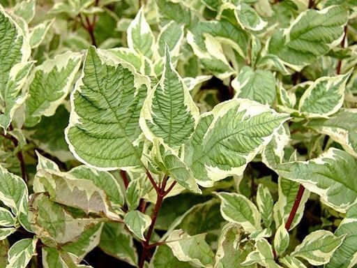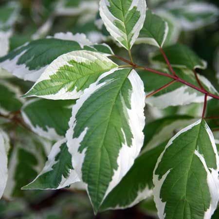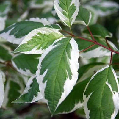 Кустарник с очень декоративными, пёстрыми листьями, может достигать в высоту 3 м, ширина кроны около 3 м. Ветви красно-бордового цвета особенно красивы осенью и весной. Листья овальной формы, заострённые на концах, светло-серо-зелёного цвета, с кремово-белой, неравномерной каймой по краям, практически не меняют окраску осенью. Цветёт обильно в первой половине лета мелкими белыми цветами, собранными в щитковидные соцветия. Плоды – белые костянки, не съедобны, появляются в сентябре. Растёт быстро, рекомендуется ежегодная обрезка весной и осенью для формирования желаемой формы куста.