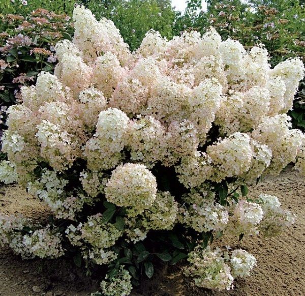 Карликовая гортензия метельчатая -декоративный лиственный кустарник высотой до 70 см привлекает внимание обильным цветением с июля по сентябрь. Крупные белые конусовидные соцветия с лимонным оттенком к осени становятся розоватыми. Пышность в цветущем состоянии достигает 1 метра в диаметре.