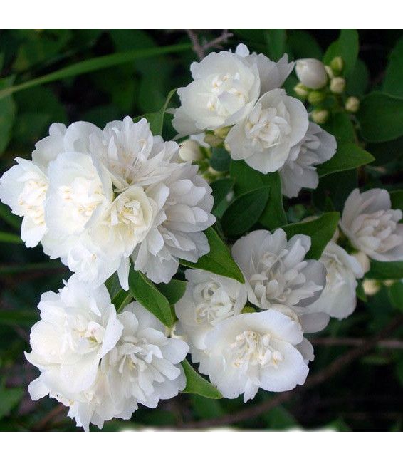 Чубушник Снежная Буря – очень эффектный, декоративный кустарник компактной формы, являющийся одним из самых ярких и привлекательных. Во время цветения кустарник полностью покрывается белыми соцветиями, словно укутан снегом.Высота куста до 1,5м высотой.