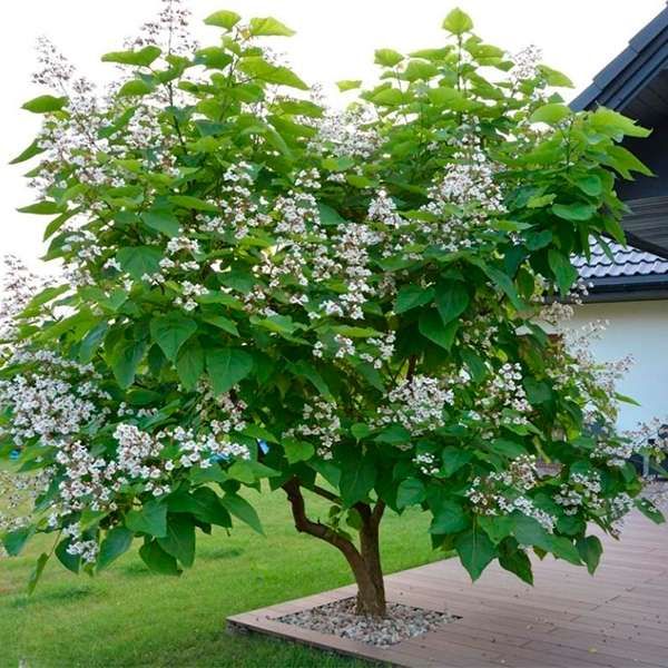 Катальпа бигнониевидная (Catalpa bignonioides) это образующее широкоокруглую крону раскидистое дерево, эффектно цветет и экзотично смотрится в парках или на участках. Средняя высота 7м, и 20 м в более теплых широтах. Ежегодный прирост от 30 до 1 м в год. Замечательны ее крупные листья, по форме напоминающие листья сирени, но больших размеров (20 х 15 см). Цвести Катальпа бигнониевидная начинает в июле. Соцветия пирамидальные, длиной до 20 см, с крупными белыми цветками. После цветения остаются плоды – длинные зеленые кинжалы, темнеющие при созревании. Листья широкие, сердцевидные. В сильную жару нуждается в поливе, а в сильные морозы молодые саженцы нужно накрывать.