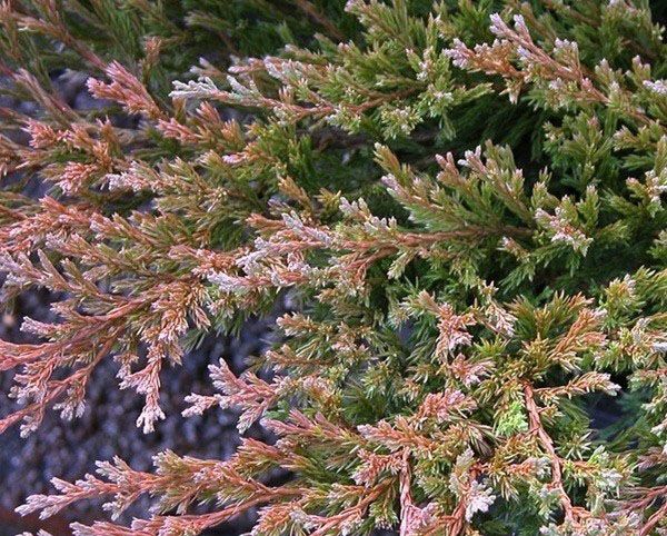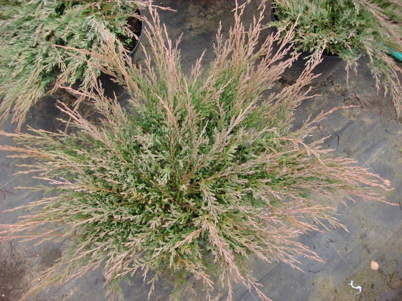 Кустарник, стелющийся по земле, с слегка воронкообразной, аккуратной кроной высотой до 0,3-0,4 м и диаметром кроны 1-2 метра. Хвоя в основном чешуевидная, изредка игловидная, мелкая, сизо-зеленого или светло-зеленого цвета, зимой с фиолетовым отливом, на кончиках побегов. Растет медленно.