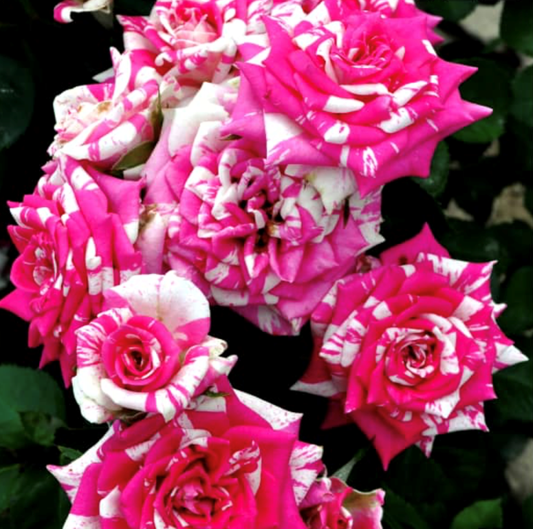 Мраморный, би-колор, розово-белый штрих из 20-25 лепестков. Роза меняет цвет от светло-розового штриха до более сочно розового в зависимости от погоды. Куст прямостоячий с устойчивыми побегами, имеющими по 25-30 бутонов на каждом. Листва полу-глянцевая. Идеально подходит для выращивания в горшках и для декоративного окаймления клумб, газонов и дорожек.Размер цветка 6- 7 см ,высота 50- 70 см, аромат средний приятный, зимостойкая устойчивая к болезням.