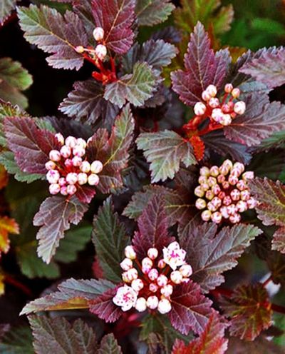 Пузыреплодник Summer Wine – многолетний декоративный, компактный, плотный кустарник, высотой до 1,5–2 м, с зонтиковидной кроной семейства Розовых. Побеги короткие, слегка поникающие. Кора на ветках красновато–коричневая, расслаивающаяся. Нарастает быстро. У пузыреплодника Саммер Вайн листья 3–лопастные, крупные, с зубчатым краем, винного цвета. В тени листва зеленеет. Бутоны розовые, цветы мелкие, до 1,2 см, бело–розовые собраны в многочисленные щитковидные соцветия диаметром 3–5 см. После цветения образуются вздутые плоды, которые по мере созревания краснеют. Цветение начинается в июне и длится около 3 недель.