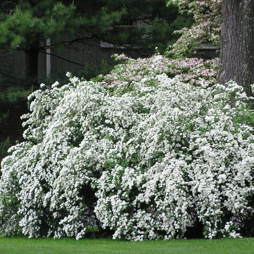 Белоснежные цветки, до 1 см в диаметре, собраны в зонтиковидные соцветия, обильно покрывающие весь куст, что придает ему вид снежной лавины. Цветет в начале июня 2—3 недели. Бывает повторное цветение в июле-августе, но не обильное.