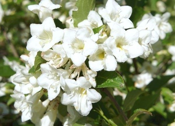 Вейгела Кандида - широкий раскидистый кустарник до 2м высотой и до 3м шириной. Годовой прирост до 30см. Обильно цветет в начале лета белыми крупными колокольчатыми до 4см длиной белоснежными цветками, собранными в соцветия по 3–4 шт. Цветение в мае-июне.Предпочитает солнечные места.Зимостойкость хорошая.Рекомендуется обрезка после цветения раз в 2-3 года .Устойчива к болезням и вредителям.Примененяется в одиночных и групповых посадках, для создания свободнорастущих живых изгородей, в рабатках и миксбордерах.