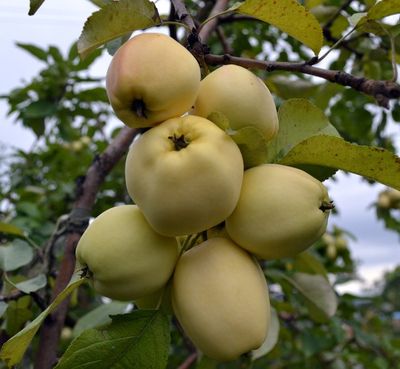 Плоды массой 95-110 г, округло-конической высокой формы, симметричные, слаборебристые. Окраска однотонная, бледно-желтая, без покровного румянца, иногда с маленьким слабым загаром. Мякоть кремовая, крупнозернистая, довольно рыхлая, умеренно сочная, хорошего кисло-сладкого вкуса. Созревание во второй половине августа, после сбора плоды хранятся до 30 дней.